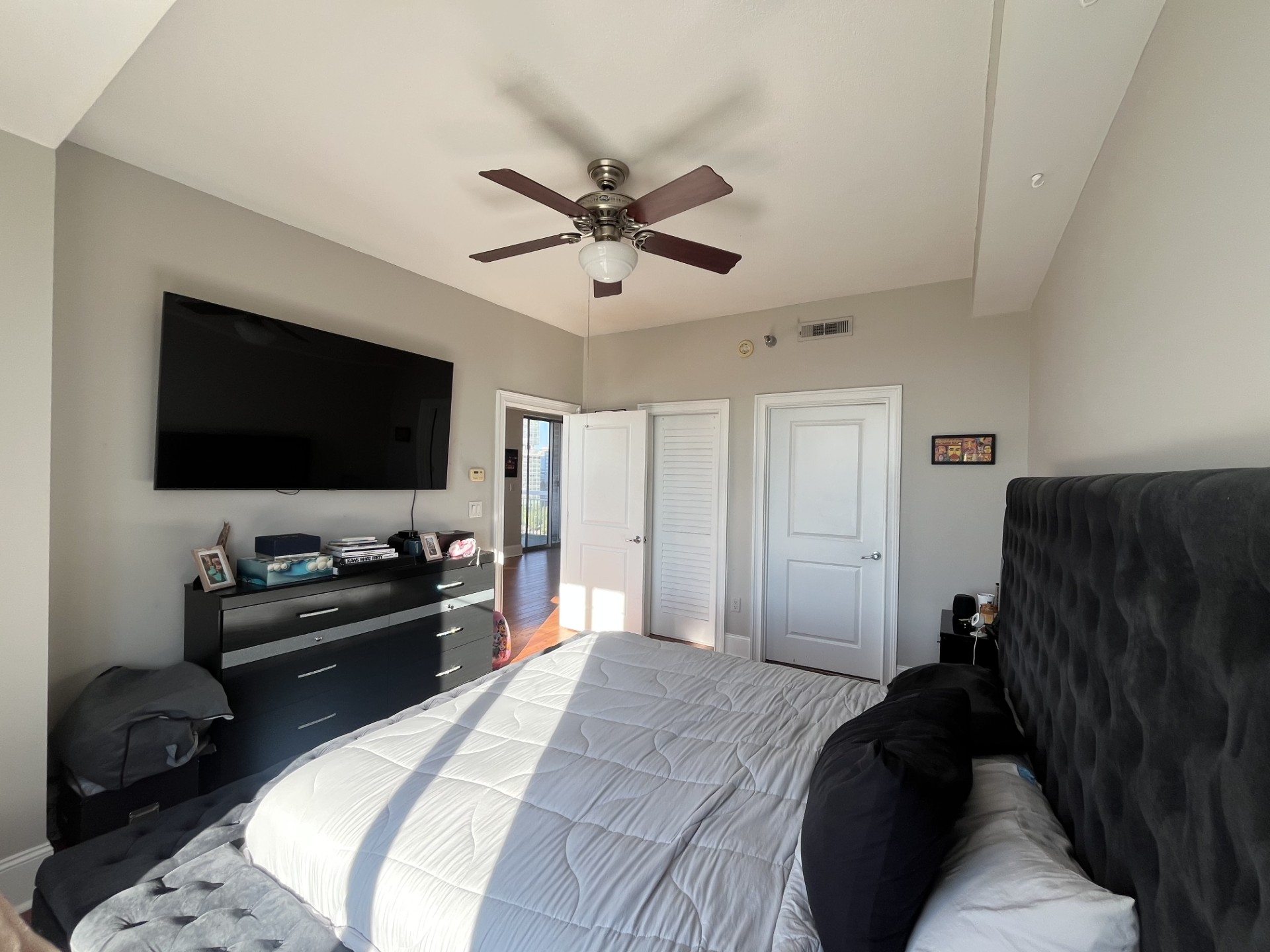 Primary bedroom suite overlooking the park and view of Mercedes-Benz Stadium has a tray ceiling with fan light and custom walk-in closet with ventilated barn door for more optimized and useable closet space